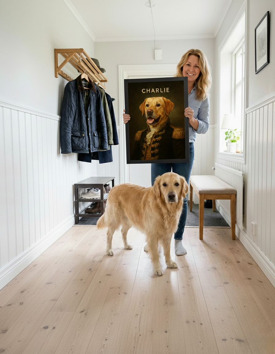 Ge din hund en självklar plats i hemmet med en personlig poster, skapad direkt från ditt favoritfoto.